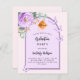 Um fundo cor-de-rosa pincelado com um arco cor roxo e violeta. Decorados com um verde floral, rosa, de cor aquosa, de cor verde, de eucalipto verde e borboletas. Personalize e adicione um nome e detalhes da parte. Traseira: cor de fundo cor-de-rosa pincelada. 1 folha = 1 convite impresso de borda a borda.
