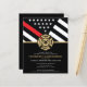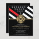 Este design apresenta uma bandeira de bombeiros com listras pretas e brancas, e uma fina faixa vermelha também. Um crachá de bombeiro está sentado acima de todos os detalhes da festa para o bombeiro graduado. Esta design também trabalha excelente para um bombeiro aposentado, tenente, ou festa de aposentadoria do chefe.