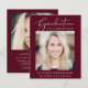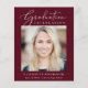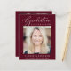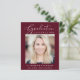 Elegante anúncio de formatura vermelha e convite de festas, amigável em orçamento, de uma garota fervilhante, com "Graduação Celebrada" em uma elegante escrita branca e tipografia branca, sua foto e seu nome, ano escolar e de aula em uma simples tipografia branca moderna. No verso, adicione outra foto e os detalhes da festa de formatura.