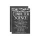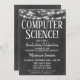 Um divertido convite para festa de formatura de computação em outdoor preto e branco com luzes brilhantes no topo.