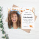 Adicione sua própria foto vertical do formando. Um quadro fotográfico colorido cor de pêssego escuro. Uma cor branca de fundo. Decorado com flores silvestres em pêssego e bege. Personalize e adicione um nome e detalhes da parte. 1 folha = 1 convite impresso de borda a borda.