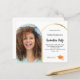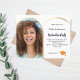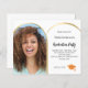 Adicione sua própria foto vertical do formando. Um quadro fotográfico em forma de arco dourado falso. Uma cor branca de fundo. Personalize e adicione um nome e detalhes da parte. 1 folha = 1 convite impresso de borda a borda.