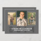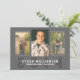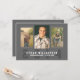 Um design desportivo moderno apresenta espaços para três fotos na frente. Em formato clássico preto e branco e horizontal. A design de tipografia de cartas de varsidade atlética destaca o nome do seu filho, ano de escola e graduação na frente e é um visual contemporâneo excelente que é perfeito para qualquer atleta jovem ou fã de esportes. Mostradas como um convite festa de formatura no verso, todas as linhas de texto podem ser personalizadas para mudar facilmente para um anúncio.