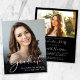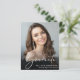 Comemore suas conquistas de formando com este anúncio de graduação e convite de festas em preto, amigável em orçamento-na moda. Sua foto favorita preenche o cartão com "Formando" colocado em cima em um roteiro elegante e branco; embaixo, adicione seu nome, escola e ano de aula. No verso, adicione uma fotografia adicional e os detalhes da sua festa de formatura em letras brancas simples.