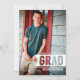 Um design simples e moderno que apresenta a foto do seu formando na frente com todos os detalhes da festa ou do anúncio no verso. Tendência, design de tipografia contemporânea com um sentimento masculino. O banner de recorte da sua foto para espiar acrescenta uma vantagem moderna. Um anúncio casual, mas sofisticado que destaca seu filho e sua celebração de graduação.
