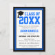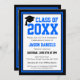 Este Convite à Festa de formatura de Fotos Azul e Preta é uma forma excelente de celebrar o segundo grau ou formando universitário. Personalize isso com o nome, escola, ano, detalhes da festa e a foto do formando no verso. Este convite apresenta uma tipografia ousada em cores azuis e pretas da escola, com uma borda azul e preta.