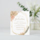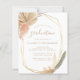 Este convite à festa de formatura de vassoura apresenta uma estrutura geométrica dourada decorada com folhas de palma tropicais secas de cor aquosa e erva-pampas em tons de bege, pêssego e verde-úmido. Personalize o texto dourado com os detalhes da sua parte. O lado inverso é uma sombra coordenadora de bege maciço de cor de pêssego.