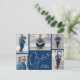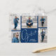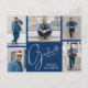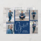 Uma grade azul de cinco marinhos de fotos mostra suas fotos favoritas na frente desses cartões postais de convite para festas de formatura junto com a palavra formando, ano de aula e nome. As informações de festa de formatura e o espaço para escrever no endereço do seu convidado estão no verso sobre uma foto do tamanho do cheio. Mais designs e cores feitas para você em nossa loja.