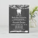 Um divertido dentista preto e branco do quadro-negro ou higienista dentário convidando a festa de formatura com luzes brilhantes no topo.