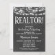 Um divertido convite para festas de formatura da escola imobiliária, preto e branco, com luzes brilhantes no topo.