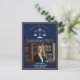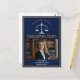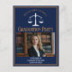 Este convite de cartão postal personalizado para festa de formatura na faculdade de direito, em azul-marinho e dourado, apresenta uma tipografia sofisticada para um formando da turma de 2024 acima da foto do seu aluno. Personalize com o seu ano de formatura sob as balanças brancas da justiça e fotografia para um convite personalizado de advogado ou procurador.