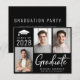 Convite moderno à festa de formatura negra, de fácil orçamento, que inclui uma colagem de 3 fotos, "Formando" em letras grandes brancas e o ano de aula, nome e escola ou universidade em tipografia simples e branca. Adicione os detalhes da parte no verso.
