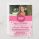 Este convite para festas de formatura tem uma borda cor-de-rosa e um círculo com o ano do formando impresso em uma fonte branca e esbranquiçada. O topo do convite 5x7 tem um lugar para personalizar sua foto pessoal. Na metade de baixo, você pode personalizar facilmente as informações de seu partido. O texto na parte inferior é escrito em uma fonte legal, rosa-quente e cinza.