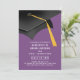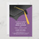 Convite para graduação roxo moderno com boné preto e formando dourado.