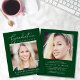 Anúncio de graduação verde e convite de festas elegante, favorável ao orçamento, com "Celebração de Graduação" em elegante roteiro branco e tipografia, a foto do formando e seu nome, ano escolar e de aula em simples tipografia moderna. No verso, adicione outra foto e os detalhes da festa de formatura.