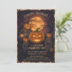 Defina um tom assustador para as suas festividades de outubro com este convite de Halloween em estilo retrô. Com uma ilustração sinistra de figuras de cabeça de abóbora assustadoras (espantalhos de Jack-o'-lantern) sob uma lua cheia brilhante, este design captura a essência de um clássico terror. A borda de pergaminho desgastado e a tipografia gótica lhe dão uma aparência autêntica e envelhecida, perfeita para uma festa de fantasias para adultos ou um evento sofisticado de casa assombrada.