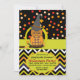 Uma coruja de olhos brilhantes está presa num galho vestindo o chapéu de uma bruxa. Bolinhas e faixas de chevron criam um fundo festivo. Um convite bonito para uma celebração de Dia das Bruxas.