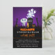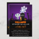 Um cartão de convite para festas de Dia das Bruxas assustador. Colocada num cemitério escuro e assustador. Um cascalho diz RIP, com uma vela e alguns crânios brilhantes no chão. Uma vedação cremosa velha se inclina para o lado. Um esqueleto fofo e sorridente está acenando e alguns fantasmas legal estão girando no ar. Colocado sobre um fundo de gradação preto e roxo. Personalize com seus detalhes de festa espetacular do halloween. Festa de fantasia, festa de truque ou de tratamento, ou seja lá qual for a sua festa de tema de halloween, o título pode ser facilmente personalizado.