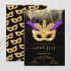 Convites de festa de mascarada de Mardi Gras modernos em dourado e roxo. Caracteriza uma máscara dourada com penas, contas penduradas e fundo de confete dourado. Ouro falso.