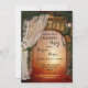 Convite festa de noivado com uma cena de floresta encantada com uma porta que leva a uma luz mágica na floresta. O véu de casamento com rosas de escamas e marfim e a lanterna de colheita dão a este convite uma atmosfera romântica.