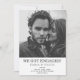 Este convite para festas de noivado moderno apresenta uma tipografia atraente e uma fotografia de casal favorita. Sacudir a placa por cima para revelar um design de faixa diagonal preto e branco na parte traseira da placa.