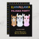 Cartão de convite para festa de pijamas de llama. Celebre uma festa de aniversário ou apenas uma reunião de festa de pijamas. Três llamas fofos em fundo preto. Padrão de estrelas multicoloridas no verso. O texto está pronto para ser personalizado. A palavra llama significa várias coisas. Llama em espanhol significa chamando e chama (sagrada). Quando você lê de trás para frente, é Tudo Eu. As llamas são conhecidas por sua bondade, unidade e compaixão. Aproveite sua festa de pijamas!!