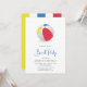 Convite de festa de praia com uma bola de praia colorida perfeita para festas de verão.