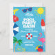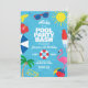 Aloha, é uma Festa de Piscina - personalize para qualquer idade ou festa de piscina! Convite de Aniversário Luau perfeito para sua festa de aniversário de piscina ou escorregador de água inflável de verão. O design apresenta fundo de água com óculos de sol, guarda-sol, picolé, bola de praia, palmeira, flamingo e flor de hibisco.