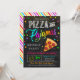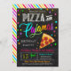 Incrível e Adorável, este convite de festa de pizza é ótimo para festas de aniversário divertidas para crianças/meninas de todas as idades! O convite apresenta gráficos divertidos e festivos em um fundo de quadro-negro falso