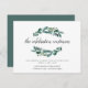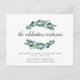 O convite de casamento botânico chic informa aos convidados que a celebração continuará pela noite! O convite para a festa após o casamento apresenta folhas de eucalipto verde exuberantes ilustradas em aquarela, emoldurando "a celebração continua" em elegante caligrafia manuscrita. Personalize com os detalhes da sua festa de casamento após a cerimônia na parte inferior. O tamanho pequeno cabe nos envelopes do convite de casamento como um inserto anexo, ou pode ser enviado separadamente com os envelopes incluídos.