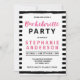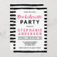Este convite para Festa de solteira chic apresenta um fundo na moda preto e branco de listras e a palavra "Bachelorette" em bonito cor-de-água rosa. Este convite também inclui um lado traseiro com padrão. Personalize este convite substituindo o texto do marcador de posição no modelo. Para obter mais opções, como alterar a fonte e seu tamanho, clique no botão "Personalizar". *Observe que a Marca d'água Zazzle que aparece na visualização de zoom NÃO aparecerá no produto impresso final © Rosewood e Citrus