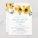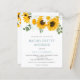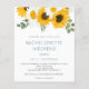 Convite para Festa de solteira Itinerária no Final de Semana de Sunflower. Um alternativo de 4,5 pol x 5,6 pol com preço inferior. Disponível em um STOCK DE CARTÃO SEMI GLOSS 110 lb, que é a opção padrão (recomendada para convites), OU um STOCK DE PAPEL THINNER SATIN FINISH 80 lb (ideal para gabinetes). Os envelopes são um extra opcional e são ligeiramente maiores que o tamanho da placa. Um buquê de flores silvestres com girassóis brilhantes enfeita a tipografia superior e na moda, abaixo, que é facilmente personalizada para os detalhes de sua Festa de solteira com seus detalhes itinerantes no verso.