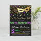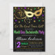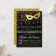 Incrível e divertido, este convite de festas MARDI GRAS / FAT TUESDAY / NEW ORLEANS / MASCARADA é excelente para uma festa de solteira memorável! O Convite apresenta uma máscara de mascarada de folha de ouro falsa e uma configuração de brilho falsa num fundo preto.
