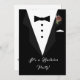 O design apresenta a aparência de um smoking na frente e o texto do convite no verso. As letras estão em uma fonte preta clara contra um fundo branco. Lembre-se, os casamentos não são apenas para a noiva!