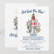 Este design mostra um farol listrado alto brilhando sobre uma divertida coleção de itens do mar. Na parte inferior, um pequeno barco flutua sobre suaves ondas de água. Atrás dele, você verá um leme de madeira, uma âncora de ferro pesada, uma bóia de resgate flutuante e um localizador de direção vintage, todos amarrados com corda grossa. O texto é de cor azul escuro e está disposto de forma organizada sobre o fundo branco simples, de modo que tudo seja fácil de ler. É um visual muito fofo e simples para uma festa de menino perto da água.