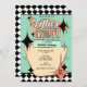 Convite para Festa dos Anos Cinquenta apresenta tipografia no estilo de letreiros modernos de meados do século XX com "Festa dos Anos Cinquenta". Este design inclui elementos de verde menta, laranja, preto e branco, padrão xadrez, fundo de bolinhas, formas retrô, estrelas e designs inspirados nos anos 50. Inclui um modelo para personalização.