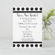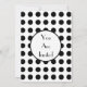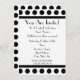 Um convite simples com um desenho de bolinhas pretas e brancas na parte superior e inferior da frente. Corte preto e fonte Parisiense preta. Personalize com detalhes da sua ocasião. O lado oposto apresenta um design sólido com uma forma circular no meio, enquadrando o texto.