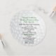 Convite à Festividades Pré-Casamento, redondo, único, com gráficos de uma aparência de bola de golfe com padrão branco. Personalize o texto preto e verde para se adequar às necessidades do seu partido de golfe. Placas RSVP correspondentes disponíveis.