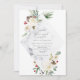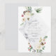 Esta design de festas apresenta flores vermelhas e brancas contra fundo neutro com folhagem, ramos e bagas e uma textura de cinza nebulosa.
