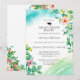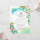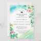 Linda praia de aquarela arenosa e céu com flores botânicas insulares e arranjos foliares, um convite para festas de formatura.