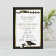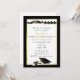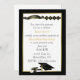 Convite de festa de formatura na moda, feito com fundo branco e um quadro de tom preto e dourado. Gráficos de uma faixa preta e dourada, em cima, e um diploma e boné de placa-mãe, em baixo. Personalize o ano e o resto do texto do convite para se adequar às necessidades do seu partido.