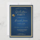 Esta imagem é um convite de festa de formatura com tema azul e dourado. Ele apresenta fontes elegantes de script de ouro, um gráfico de boné de formatura pequeno, e inclui espaços reservados para o nome do formando, escola, ano de aula, data do evento, hora, local, detalhes de RSVP e uma foto no verso. A design tem um tom formal e comemorativo. Personalize para um toque pessoal!