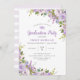Barato de convites de festa de formatura impressos personalizados. Este bonito design feminino tem uma borda floral de cor d'água com flores roxas pastel e verde. Personalize o modelo com os detalhes do evento. O verso tem um padrão de faixa de aquarela roxa ou use o espaço para adicionar texto e fotos adicionais. Clique em Personalizar para escolher qualquer cor de fundo e editar as fontes e cores do texto para criar um convite de festas de formando exclusivo para sua filha.