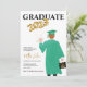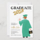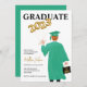 Convite à graduação para festa de formatura de cara. Retrato masculino formando em boné e vestido verdes, cabelos vermelhos e balões de ouro 2023. Personalize todos os detalhes de seu formando para um convite exclusivo de graduação.