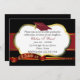 Convite de festa de formatura elegante feito em preto e vermelho, com sotaques dourados. Uma área de texto em branco com borda dourada decorativa tem texto vermelho e preto pronto para personalizar. Fundo preto, com gráficos de uma fita vermelha e dourada sobre o meio, um boné da placa de formando vermelho, na parte superior, e uma faixa vermelha e dourada, na parte inferior. Excelente parece festa de formatura.
