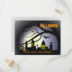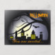 Convite urbano do partido aduld no Halloween. Ele apresenta uma sinistra paisagem urbana de prédios com luz amarela atrás das janelas, um gato preto, morcegos e um crânio diante de uma cinza enorme lua.