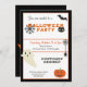 Um convite de festa do Dia das Bruxas em cores preto e laranja com morcego, gato preto, aranha, fantasma e abóbora Jack O Lanterna. Perfeito para uma festa de fantasia!