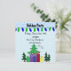 Um convite encantador para enviar um feriado ou uma festa de Natal. Árvores de Natal cercadas de presentes e passarinhos cantando por cima. Uma sequência de luzes verdes e azuis acentua o topo do convite. Personalize com todas as informações de seu próprio partido, conforme desejado.