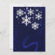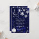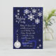 Convite para festa Elegante Holiday feito em fundo brilhante decorativo azul escuro, com gráficos de flocos de neve brancos e um ornamento prateado e branco de bola de Natal. O texto em branco está pronto para personalizar o seu evento de feriado. Adorável convite festivo.