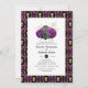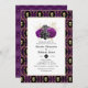 As madrinhas góticas roxas, pretas e douradas convidam-se para o almoço, apresentando rosas e um ornamentado de fundo do crânio com um padrão de latência inverso.
